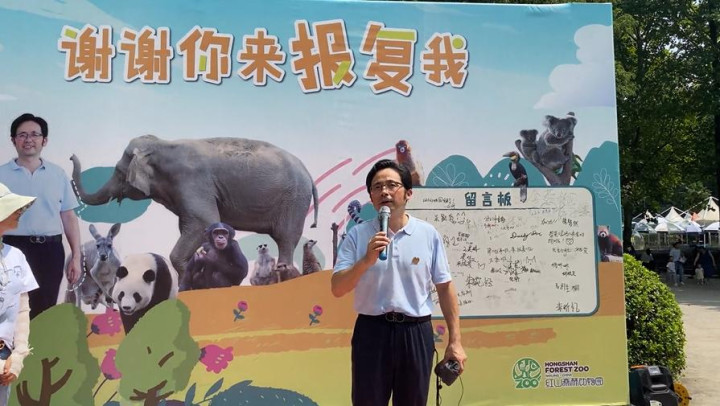 演讲后,《中国新闻周刊》曾前往红山,在园中看到了巨幅的展板,展板上沈志军的脸和大象、长颈鹿、熊猫、袋鼠等印在了一起,中间赫然写着“谢谢你来报复我”。